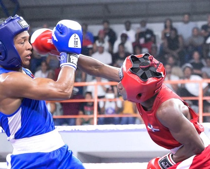 Keury Alcántara, izquierda, de la selección de Santiago,protagonizó una de las peleas más movidas de la jornada final de la Copa. Aquí esquiva un recto largo de derecha de su rival Fredelin De Los Santos, Selección Nacional, quien lo venció por cerrada decisión 3-2. Foto fuente externa.
